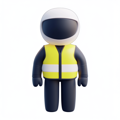 3D rendering icon of motorcyclist wearing a yellow neon vest on a white background, flat straight on view, in a clay-like style, with a minimalistic design featuring softened shapes and rounded corners. The material has a matte plastic appearance, with a navy blue and white color scheme. High-resolution photography, Octane render, and studio lighting create an isolated object with soft shadowing and no mockup frame. --ar 1:1