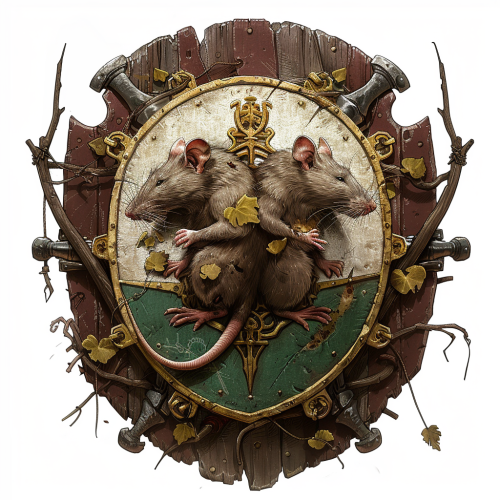 A simple royal seal for a fantasy kingdom. The sigil is two rat fighting each other, on a shield. Looks like its made from junk wood and garbage. Hinterlands Green, gold, and crimson colors. White Background. Dnd art style. --v 6.0