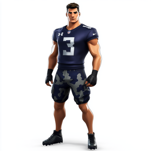 mid 20s Spanish male, United states navy football jersey, no pads, navy blue and black camo shorts, black under armour cleats, white background, rendered in the style of fortnite