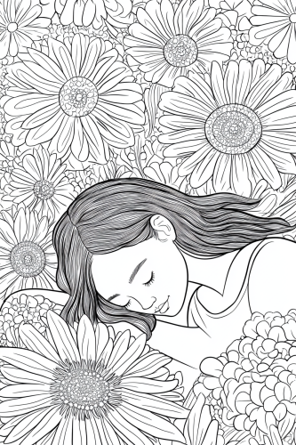 a simplistic uncolored page of a woman laying in an open field, with large daisies surrounding her, with abstract mandala designs in the background --ar 2:3