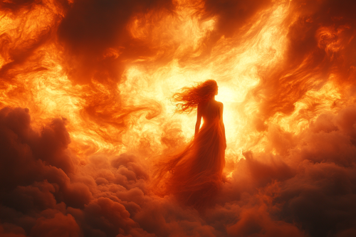 mystical representation of heaven a woman made of pure light floating in the clouds, overlooking a vast abstract landscape, good and evil, realistic yet ethereal, strong cinematic pose, intricate imagery, organic sinuous line work, fluid dynamic brushwork, enigmatic expression, intricate detail, devilcore --chaos 40 --ar 3:2 --stylize 888 --v 6.1