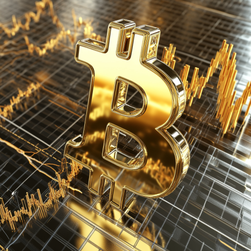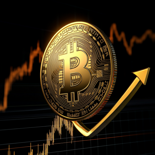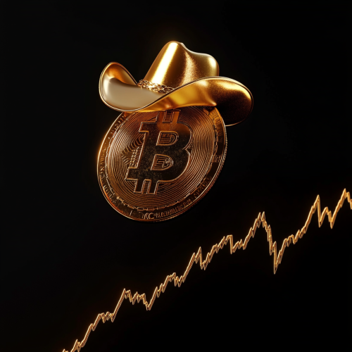 3D realistic image of a golden, shiny Bitcoin symbol riding an uptrend chart like a cowboy, facing the upward-moving line. The Bitcoin has a cowboy hat, with polished gold details and reflections, positioned dynamically on a steep, upward-trending chart line. The background is deep black, creating contrast and emphasizing the shiny, metallic gold of the Bitcoin and the bold, rising movement of the chart