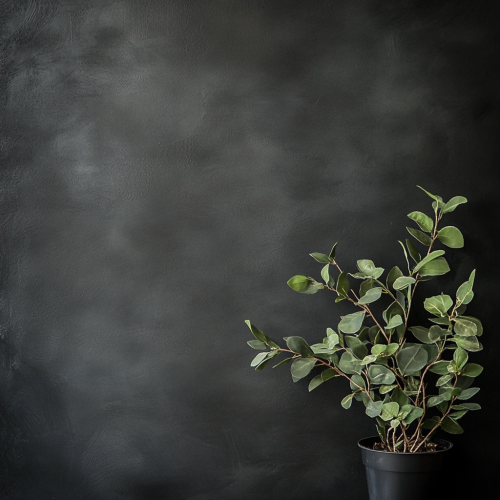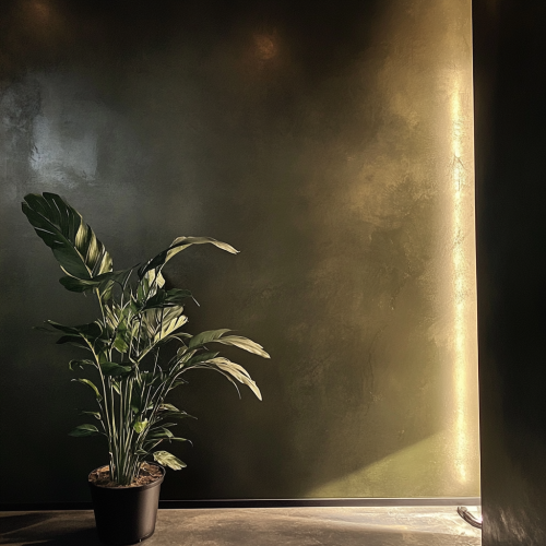 Matte deep olive wall with a smooth gradient lightening toward the top, ambient lighting providing a sophisticated warmth, a tall leafy plant positioned at the corner, bringing a natural yet refined touch to the composition.