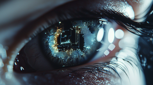 close up of eye with technology symbols and imagery representing artificial intelligence, machine learning, cloud computer, rpa, blockchain, and automation technologies., --v 6.1 --ar 16:9 --q 2