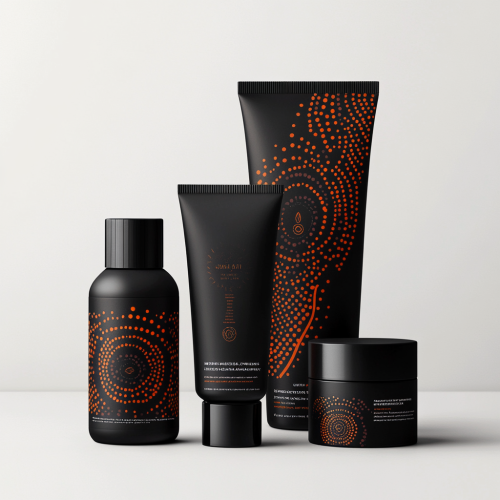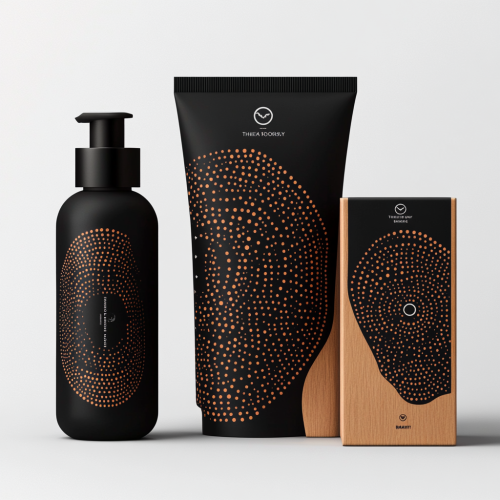 For Theta Body's packaging design, maintain a sleek and masculine aesthetic while incorporating Aboriginal-inspired artistry: Partial Dot Pattern Overlay Design Approach: Overlay a section of each product with a transparent dot pattern on the matte black base. This can be wrapped around the middle or used as an accent near the label. Product Differentiation: Assign each product a unique section for the pattern (e.g., a vertical side stripe for shampoo, a bottom border for the eye lift) to create subtle product recognition.