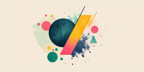 an abstract geometric composition using flat colors, splatter and spray paint, use yellow, orange, green, pink, blue elements, include negative space, minimalist --ar 2:1 --s 50