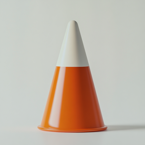 3D rendering icon of a orange safety cone on a white background, flat straight on view, in a clay-like style, with a minimalistic design featuring softened shapes and rounded corners. The material has a matte plastic appearance, with a navy blue and white color scheme. High-resolution photography, Octane render, and studio lighting create an isolated object with soft shadowing and no mockup frame. --ar 1:1