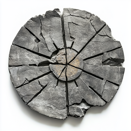 photo of an ancient stone disc with sun rays and long pointed details coming from the center. The ancient stone is broken. Flat photo, white background
