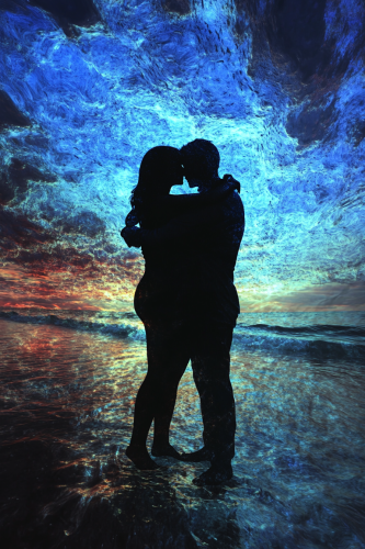 autostereographic and melancholic style, it shows one dark silhouette and a second one bright and blue at the beach, the bright silhouette gives the other one a hug, the sky looks like if you mixed up all different oil colors in water, colorsplash, melancholic art and a whole lot of sureality, --ar 2:3 --v 6.1