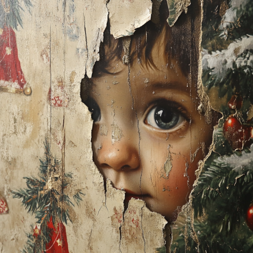 full background entire image of a wall covered in Christmas decorated wallpaper, somewhere in the wallpaper there is a tear and eyes of a small child are peeking through the tear as if take on the opposite side