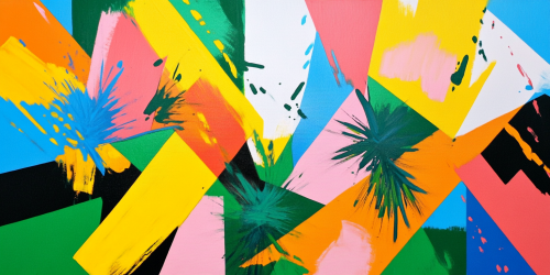 an abstract geometric composition using flat colors, splatter and spray paint, use yellow, orange, green, pink, blue elements, include house plants and negative space, minimalist --ar 2:1 --s 50