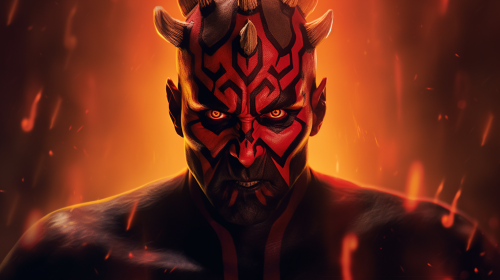 A centered, highly detailed portrait of Darth Maul from Star Wars the clone wars, his intense, red and black tattooed face illuminated by a fierce, fiery glow. He is glaring directly into the camera with a deathly stare, his red Sith eyes glowing with rage. His signature horns are fully visible, and his expression is one of pure fury and dark power. In the background, a chaotic inferno blazes, casting dramatic shadows across his menacing face, enhancing his intimidating presence. The fiery atmosphere reflects his inner rage and power, capturing his dark, Sith nature with intricate detail and intensity. --v 5.1 --s 1000 --ar 16:9