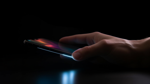 a hand picking up the phone in a dark background photorealistic, high resolution, rectangular, vibrant colors, perfect for a PowerPoint background, cinematic lighting, 16:9 aspect ratio --ar 16:9 --v 5.0