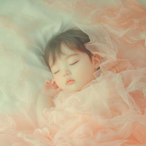 A serene and cozy image inspired by '나비잠' (butterfly sleep), evoking a sense of gentle, peaceful rest. The scene shows a close-up view of a soft, warm setting, such as a sleeping baby wrapped in delicate, airy blankets. The color palette includes pastel hues--soft pinks, gentle blues, and warm creams--creating a tranquil, dreamlike atmosphere. Soft light filters into the scene, adding a warm glow. The style is gentle, comforting, and captures the innocence and calm of a peaceful sleep. in korea. 1950's