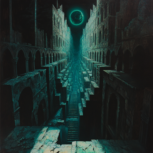 a yawning abyss, it's sides lined with Escher-like stairways and Gothic revival skyscrapers and structures, a singularity is the only thing visible in an empty black sky, and the only illumination is from eerie blue and green phosphorescent light.