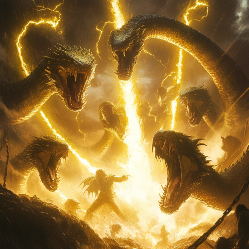 An elite force known as the Legion of Medusa, stands fearlessly against a massive, roiling abyss of dark energy, their fierce serpent heads glowing with potent, high-vibrational power. Their scales pulse with intense, radiant energy, forging a nearly impenetrable barrier that obliterates all malevolent forces attempting to breach it. Each Medusa servitor radiates a lethal grace, their stances unwavering, exuding pure, unstoppable aggression. They unleash torrents of quantum-charged golden light, rippling from their hands in waves that transform shadows into mere remnants of inert energy. The atmosphere brims with electric intensity as beams of celestial light cut through the darkness, highlighting every powerful figure with dramatic, radiant illumination. Unmatched in their ferocity, this formidable legion is the universe's most dominant force of attack and protection, leaving no shadow unturned and no threat undeterred.