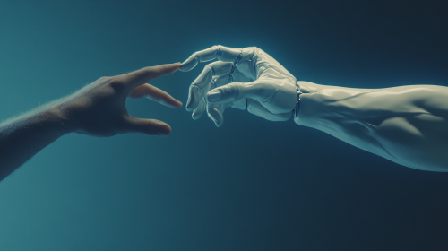 An image that simulates the painting of the creation of Adam, but using the meeting of a human hand with a hand that simulates artificial intelligence. Neutro scenario and blue tones. --ar 16:9