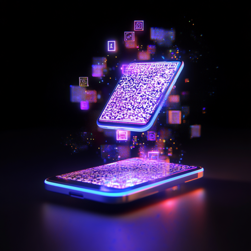 An imaginative photo. A mobile phone scanning a QR code. From the screen of the phone, a digiftal content (3D model) is emerging. No human. All elements are floating. Mobile phone screen is not transparent.