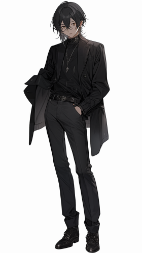A anime beautiful young man;full-body-length-illustration;facing-front, smiling-face;gray eyes, light pigmented black hair;Ephemeral and cute; "He is a dark man.";No-background-image; --niji 5 --ar 9:16