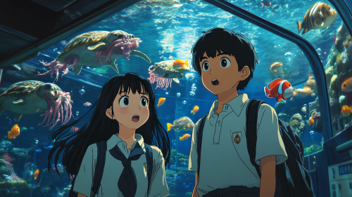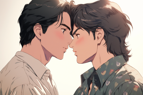 1980s anime two handsome japanese men, kissing each other, romantic, vhs, japanese teen male, --ar 3:2 --niji