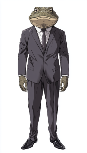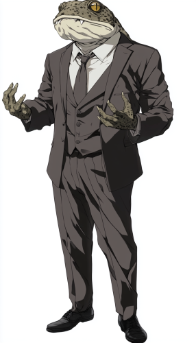 A human with a toad head. wearing a suit. Standing picture. The background is white. the anime character. A pose that attacks you. Monster. bark. full body --ar 4:7 --s 40 --v 6.1