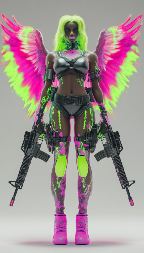 angel with two ak-47s with full body, cartoon, hyper realistic, 32k, 3d, ultra realistic, photo realistic, HDR, neon green and pink, vibrant colors, full shot, white background, high quality, ultra detailed, super detailed, environment --ar 4:7