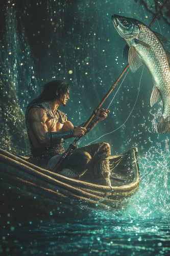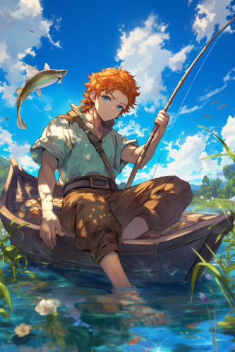 4K anime style quality, digital drawing mode, medieval fantasy-themed anime male character with a fishing pole, sitting in a small woden boat, A giatn fish leaping out of the water, fantasy lake background, determined and fierce expression, full body, dynamic pose, life size, perfect anatomy, detailed skin texture, full HD, 4K, HDR, perfect anatomy, depth of field --ar 2:3 --niji 6