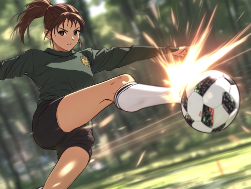anime style, motion blur, a woman kicking a football, soccer, dressed in dark green athletic top, black athletic shorts, white socks, firing towards the goal, brown pony tail hair style, light tan skin --ar 4:3 --no american, no background