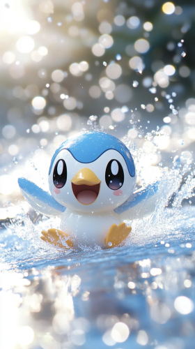 An ultra-cute chibi Piplup Pokémon sliding on ice with joy. The scene is bright and vibrant, with shimmering ice and snow all around. Piplup's playful expression captures the fun of the moment as it slides smoothly across the icy surface. High quality, 8K, HDR. --ar 9:16