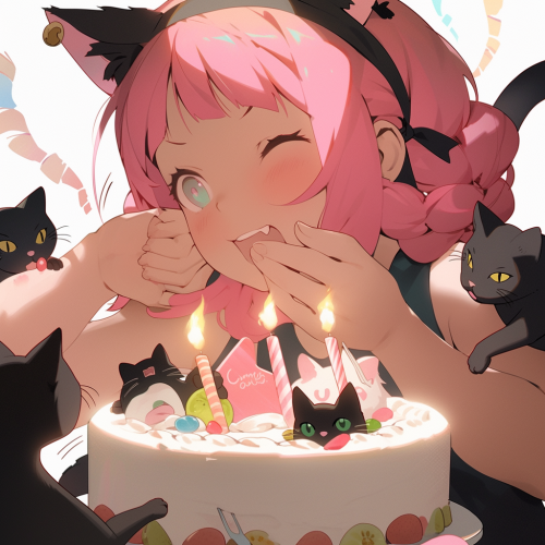 Pink-haired girl with pigtails sticking out her tongue and sawing an eye, has a birthday cake in front, there are several kittens eating the cake --niji 5 --style expressive