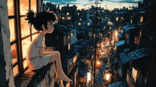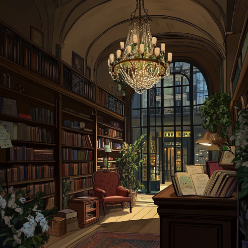 an animation drawn in the style of studio Ghibli of a cozy Parisian vintage located on an upper level featuring antique wooden furniture of floral, upholstered chair and leather bound books stacked on a dark wooden shelf, a decorative chandelier with hanging crystal ornaments softly illuminates the space through a large window. The view looks down into a historic ornate, indoor passageway, shopping arcade below with arch windows, intricate moldings, and the glass ceiling people walk along the elegant corridor line with potted plants and Shop a contrast between the bookish upper level interior and the lively light filled scene below