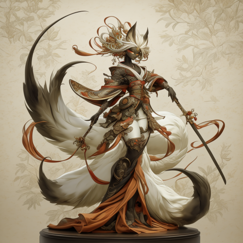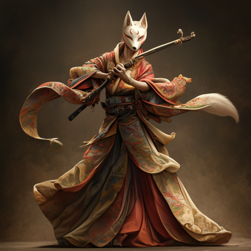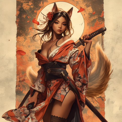 beautiful Kitsune female wearing an exquisite silk kimono on her pale skin, dancing wields a katana, photorealistic oil painting, 8k resolution --niji 6 --p 4odw11f