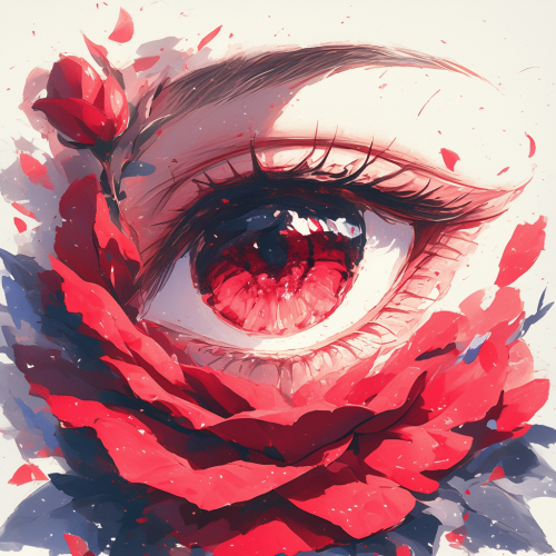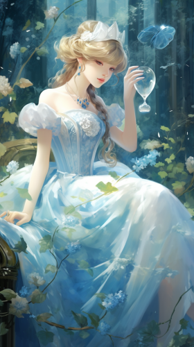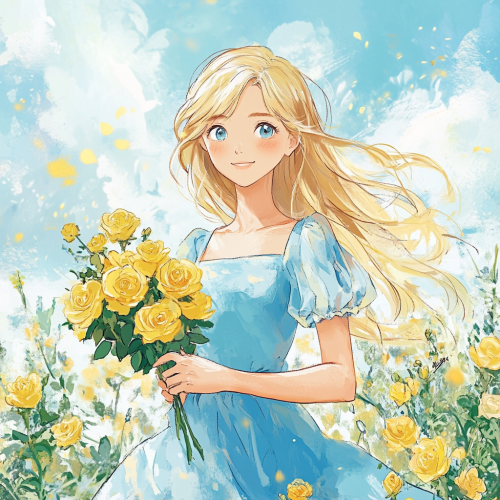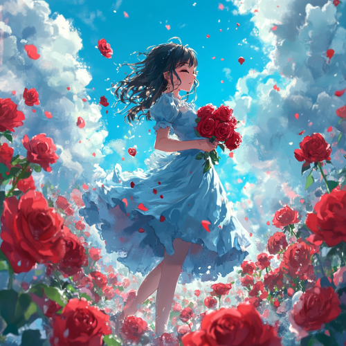 A girl in blue dress holding red roses, walking through the red rose garden, pastel color palette, charming anime characters, light white and sky-blue, character caricatures, cute cartoonish designs, ar 9:16 --v 6.1