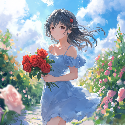 A girl in blue dress holding red roses, walking through the flower garden, pastel color palette, charming anime characters, light white and sky-blue, character caricatures, cute cartoonish designs, cute illustrations, ar 9:16 --v 6.1