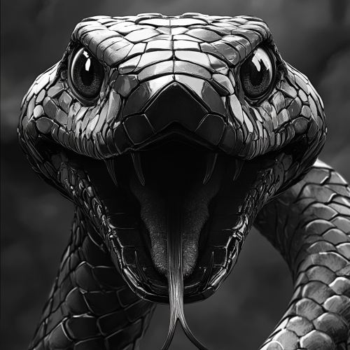 Black and Grey cobra with open mouth staring at the viewer. Show the full snake body. Done in illustrative style. Make it look like anime chrome and full of spikes. Give it a third eye