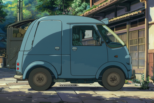 DVD screengrab, 2010 Studio Ghibli anime movie, a tiny ligier js4 microvan. entire van showing and sideways angle of it. long open truck bed in the back. window down --ar 3:2 --v 6.0