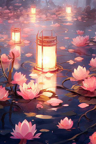 an image of a flower with lanterns floating on water, in the style of anime aesthetic, light beige and pink, aquarellist, chinapunk, light pink and light maroon --ar 2:3