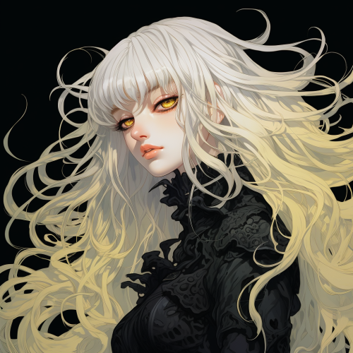 90s anime style baddie, anime cartoon style bone goddess, long white hair, long thick lashes, yellow eyes, pale skin, elegant black dress, witchy aesthetic, cool tones, 90s anime style still frame, anime cartoon still frame, hyper detailed