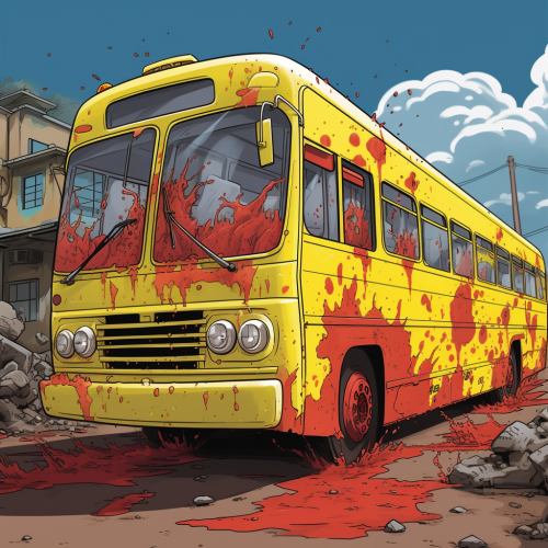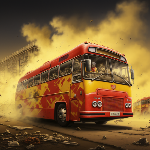un bus remplit de supporter de football ou l'on voit des bras des japbes qui sortent du bus avec des fumigene rouge et jaune le design doit etre le meme que celui dans les dessins animé