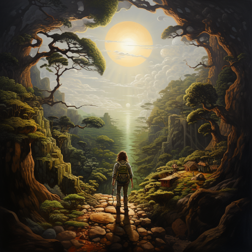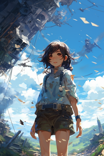 The Spirit of young girl wear on cyberpunk clothing, from a distance looking up fantasy kingdom of cyber army in mountain, fantasy blue sky, in the style of exotic realism, realistic color palette, global full colour trending, masterpiece, heavy shading, makoto shinkai, anime art, mappa studio, studio ghibli --ar 2:3 --v 5.2