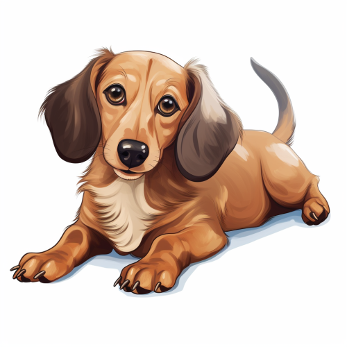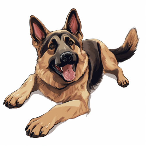 anime cartoon The GSD dog lies stretched forward showing its paws , 2d style , white background