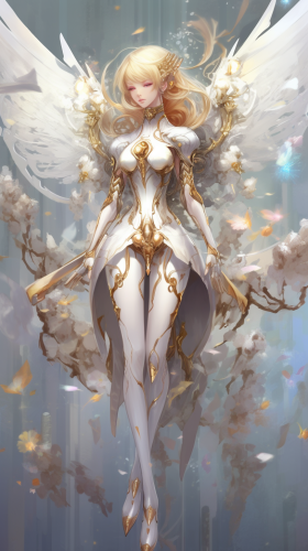 full body, divine girl, dynamic pose, slim figure, mechangel, mecha wings, halo, crown, lush blonde hair, ([matte white plastic:shiny golden:0.6] armor:1.1), luxury clothing, broken city, dancing petals, sacred signs, pastel colors, maximum details --ar 9:16 --s 750 --style raw --v 5.1