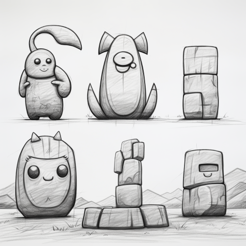 preliminary sketch , line drawing, minimalist, concept art, Easter Island stone statues , in the shape of Pokemon characters