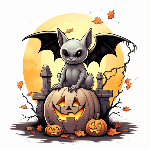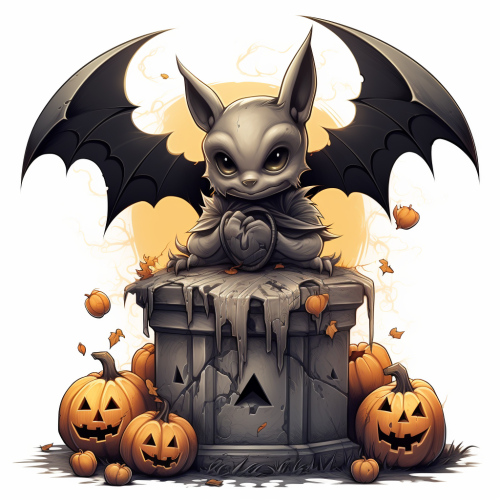 Halloween pumpkin in front of a gravestone, a cute little bat sits on the gravestone, bats in the background, white background, Traces Like From new school Tattoos, , Aggressive dynamic Thick Strokes, 2 Dimensions, Drawing, Digital Painting, anime style, new school tattoo style, cute by kelly doty,