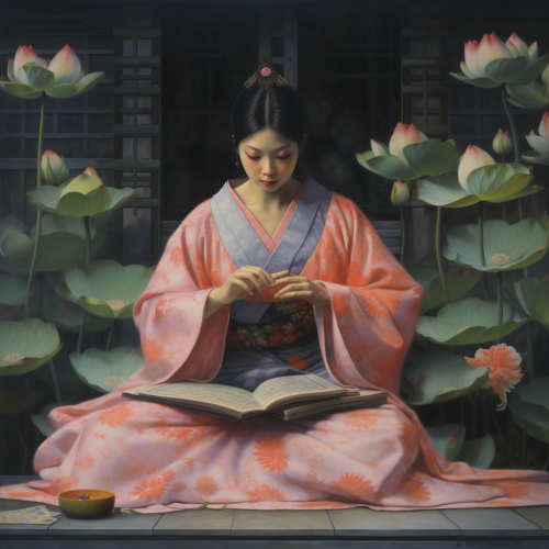 Japanese women, sorceress, fan partially covering her mouth, lotus blooms on her robe, dungeons and dragons --v 5.1
