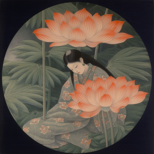 Japanese women, sorceress, fan partially covering her face, lotus blooms on her robe --v 5.1