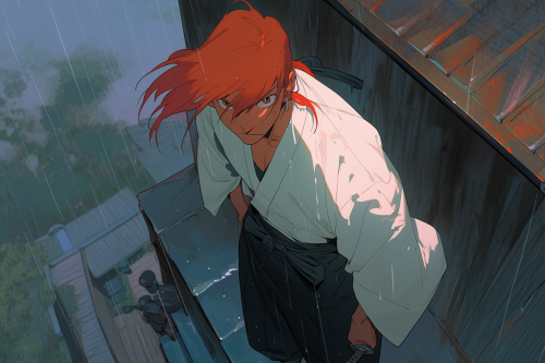 80s anime still, male character himura kenshin, red hair in a high ponytail, white hakama,rainy weather,looking at the camera intensely, isometric wide-angle, fullbody-shot, art style of rurouni kenshin, --ar 3:2 --niji 5 --style expressive