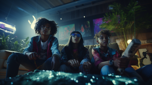 [action: 4 kids playing games. Type of kids 1 Indian, 1 African, 2 White] [A couch in front of the TV, the kids are holding PlayStation controllers. Around them in the air flying different holographic games][Wide-angle shot, Cinematic lighting, cinematic cinematography, 35mm - film - grain, 8k, ultra photoreal, intricate details, cinematography style of greig fraser] --ar 16:9