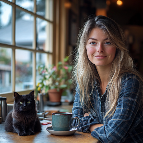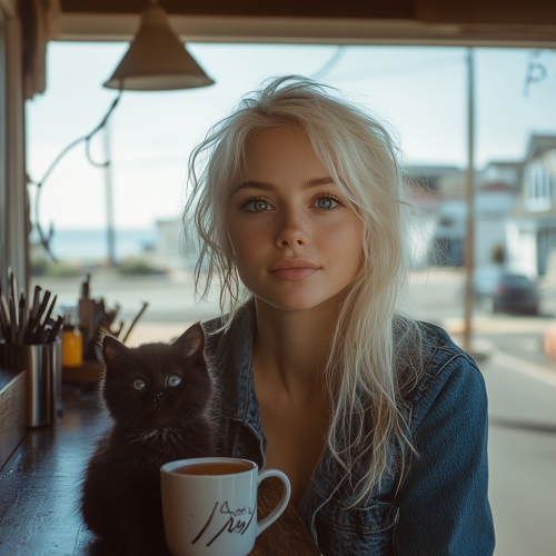 Photo of a naturally beautiful 26-year-old fresh faced woman in a hair salon with skylights: wearing denim and flannel. Black kitten. Scissors and mug of tea on a table. Out the window, a small town near the California ocean. Photo taken using a Canon EOS R camera with a 50mm f/1.8 lens, f/2.2 aperture, shutter speed 1/200s, ISO 100 and natural light, Hyper Realistic Photography, Cinematic, Cinema, Hyperdetail, Ultrahd, Color Correction, hdr, color grading, 8k happy, smiling --stylize 250 --v 6.1 --ar 1:1