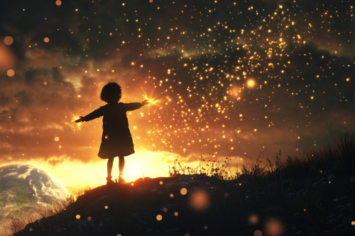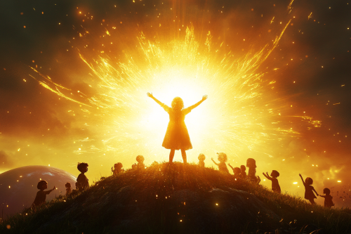 3d CGI animated image of a child standing on a hilltop shouting, with small group of children behind her, as golden rays shoot from her glowing body, and the dark, gloomy Earth below begins to brighten, very detailed, bright colors, childrens book image, cinematic lighting, --ar 3:2